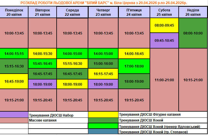 РОЗКЛАД РОБОТИ ЛЬОДОВОЇ АРЕНИ "БІЛИЙ БАРС" м. Біла Церква з 20.04.2026 р.по 26.04.2026р.